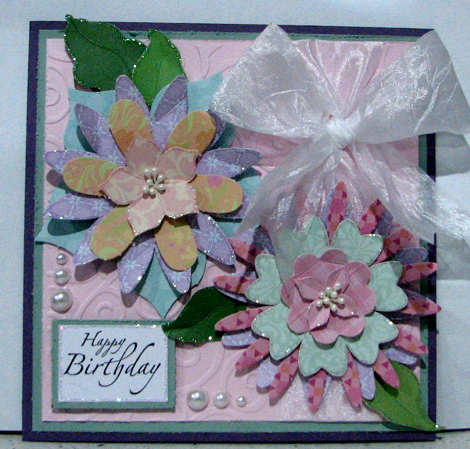My daughters boyfriend needed a birthday card for his mum and I said I would make one for him, well nothing like last minute, he needed the card for this morning. I had no time for colouring an image so I used my K & Co paper flowers, which is a 12x12 pad of die cut flowers and leaves. The sentiment is Stampin Up. I finished it at midnight, it is much prettier IRL.