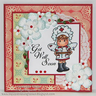Good evening,today is oldie but goodie day at Bugaboo......where the DT get to showcase some of the older but not forgotten images.I chose this little cutie,I didn't have any get well cards in my stash so thought this would be the perfect opportunity to make a get well card for my stash.You get the sentiment with this image and I have merged them together using Microsoft Office Word.I have embossed and inked the edges of the punched flowers and have also used stickles on some of the flowers and the wings.The rhinestones,rosebuds and doily all came from Bizzy Becs.Don't forget to stop by the Bugaboo blog and check out the fabulous creations by the rest of the DT.Well off to do more blog hopping,it is taking me a while as it is just making me feel more tired, but I am getting there.Thanks for stopping by.
